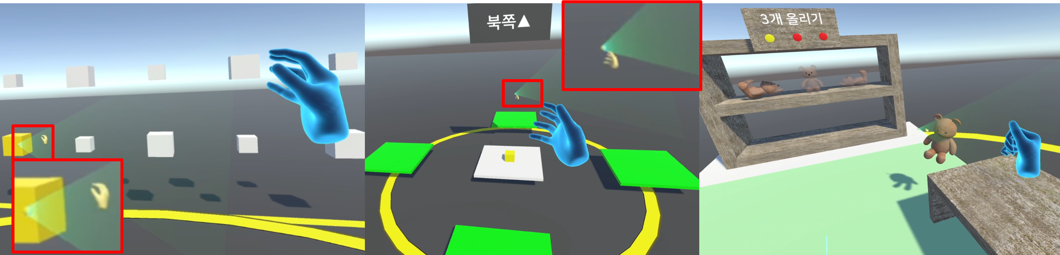 - 가까운 곳이나 먼 곳에 있는 물체를 바라보면 그 앞에 충돌점을 기준으로 가상 손 세트가 이동합니다. 이때 충돌점과의 거리는 저장됩니다.