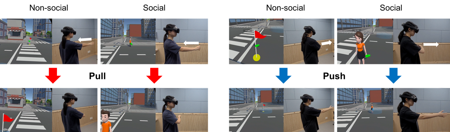 참가자들은 상호작용 방식에 따라 2가지 집단으로 나뉘었습니다. 대상을 당겨오느냐(Pull), 밀어내느냐(Push). 그리고 참가자에게 자신의 사회적 자원 수준을 물은 후, 가상현실 기기를 착용하게 했습니다. 이때 참가자에게 “이 실험에서 나타나는 아바타는 실제 사람이다”라고 이야기해주고 실험을 진행했습니다. 가상 공간에서 참가자들은 무작위로 나타나는 3가지 대상 (남성 아바타, 여성 아바타, 깃발)을 잡고 자신에게 할당된 행동(앞으로 당겨오거나 뒤로 밀어냄)을 반복적으로 수행했습니다. 대상을 당겨올 때는 손을 뻗어 움켜쥐고 자신 앞으로 갖고 와 놓는 과정을 반복하고, 대상을 밀어낼 때는 손을 자신 앞에 두고 움켜쥐고 전방으로 뻗어 놓는 과정을 반복했습니다. 대상이 이동할 때, 가상 손이 아바타의 손이나 깃발의 가운데 부분을 실제로 잡는 것처럼 표현하여 활동에 더 몰입할 수 있도록 했습니다.